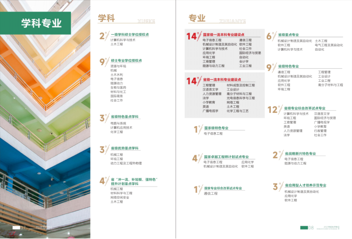 通信工程、软件工程、社会工作、电子信息工程、机械设计制造及其自动化、计算机科学与技术、应用化学、能源与动力工程、环境工程、工商管理、国际经济与贸易、自动化、会计学、工业工程14个专业入选国家级一流本科专业建设点。